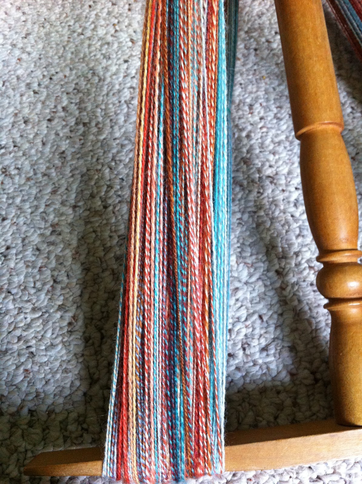 I dusted off the spinning wheel and finished up this skein of yarn that has been sitting around for a while. It ended up being a light fingering weigh, 460 yards. I love the colors and have to decide what I want to knit with it.